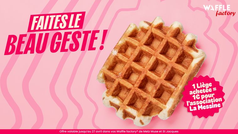 FAITES LE BEAU GESTE ! Jusqu'au 27 avril, pour tout achat d'une gaufre de Liège dans vos Waffle Factory de Metz, 1€ est reversé à l'Association LA MESSINE 💝